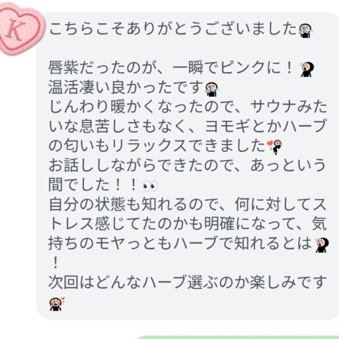 サウナが苦手なお客様ですが、じんわり温めるよもぎ蒸しはとても喜んでいただけました❤️