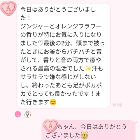 汗もサラサラで嫌な感じがしないし、終わったあとも足がポカポカでとっても良かったです!また行きます😄
